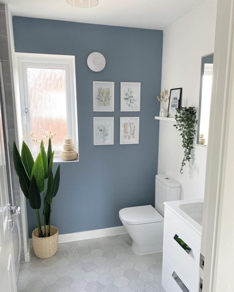 Aunque no es muy común, los cuadros decorativos para baños son una gran manera de hacer resaltar las paredes pintadas. Juega con los colores y tamaños de los cuadros para darle más vida a esas paredes.