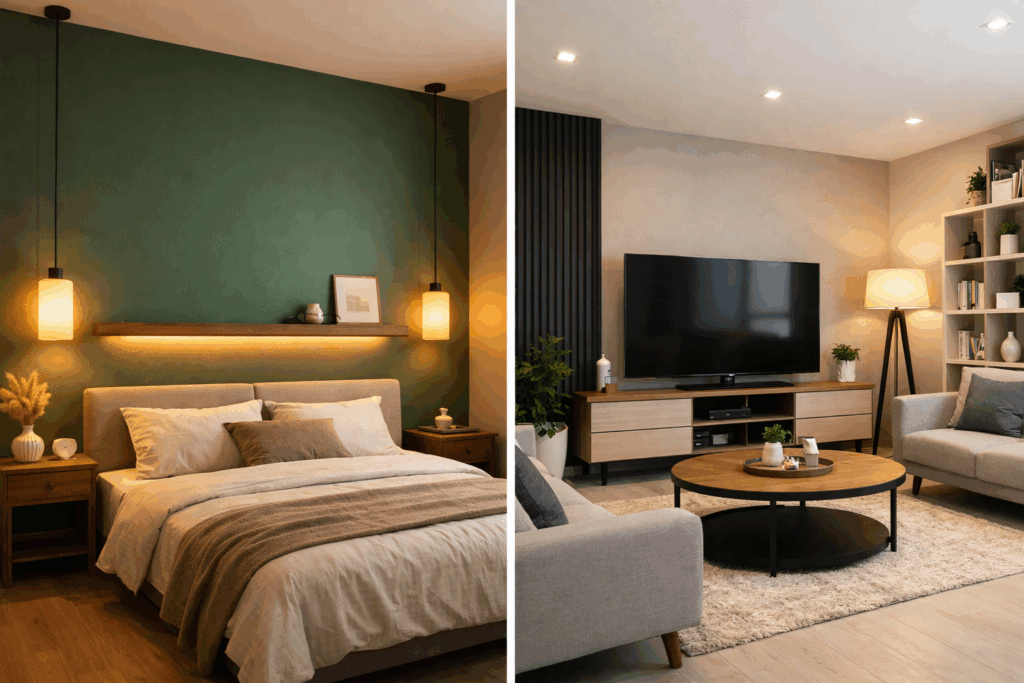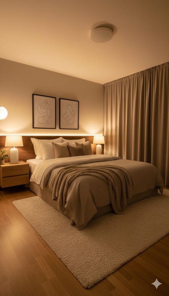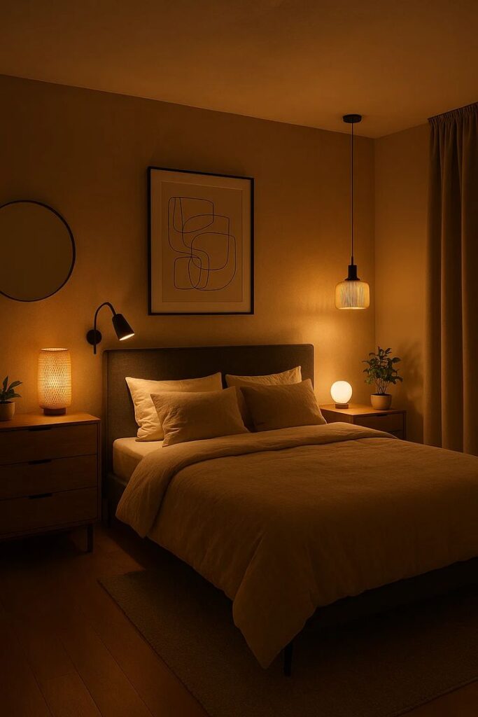 La iluminación amplia e intensa no conviene en un dormitorio, todo lo contrario, con la sala de estar o cocina. En el dormitorio requerimos iluminación descendente en intensidad.